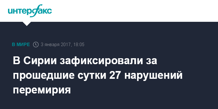 Москва. 3 января. INTERFAX.RU - В Сирии за прошедшие сутки зафиксировано 27 нарушений режима прекращения огня со стороны вооруженных формирований, сообщает во вторник Минобороны России.