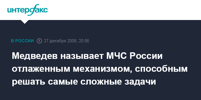 "Министерство по чрезвычайным ситуациям - это, наверное, сегодня просто одна из лучших в стране отлаженных административных и в то же время человеческих машин, которая способна решать очень сложные задачи. Министерство работает как единый организм. И, кстати, только поэтому вам удается справляться с теми задачами, которые стоят перед вами, потому что по сути практически каждый день сотрудники МЧС совершают подвиг в прямом смысле этого слова", - заявил Д.Медведев.