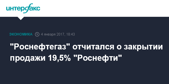 Москва. 4 января. INTERFAX.RU - Вслед за покупателями (катарский суверенный фонд QIA и нефтетрейдер Glencore) - продавец 19,5% акций "Роснефти" - АО "Роснефтегаз" отчитался о закрытии сделки.