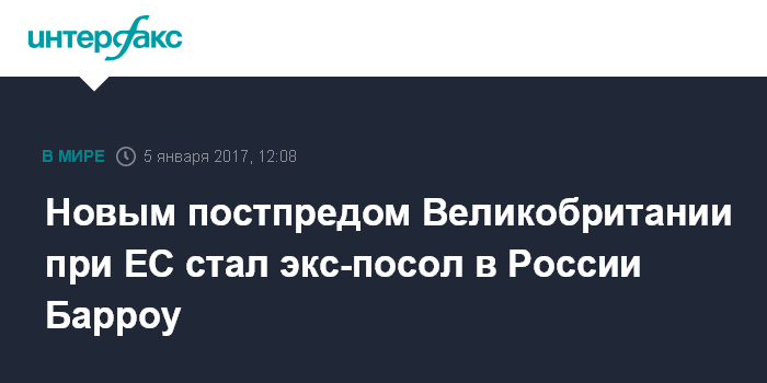Москва. 5 января. INTERFAX.RU - Правительство Великобритании в среду вечером назначило нового постоянного представителя при Европейском союзе, выбрав карьерного дипломата Тимоти (Тима) Барроу, который был британским послом в России в 2011-2015 годах и на Украине в 2006-2008 годах, говорится в сообщении канцелярии премьер-министра.