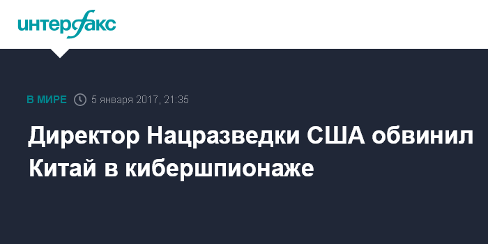 Москва. 5 января. INTERFAX.RU - Китай осуществляет кибершпионаж против США и других иностранных целей, заявил директор Национальной разведки США Джеймс Клэппер.