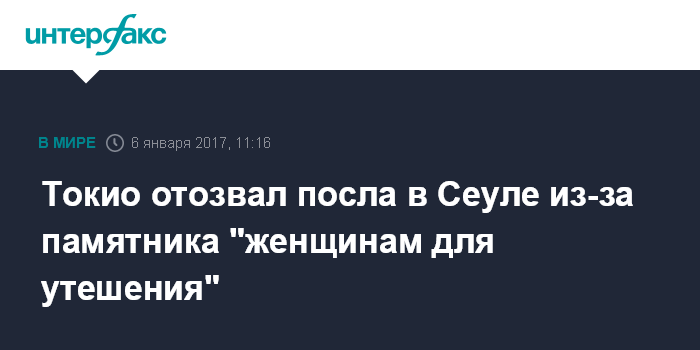 Москва. 6 января. INTERFAX.RU - Япония объявила об отзыве посла в Южной Корее в знак протеста против установки в декабре напротив японского консульства в южнокорейском городе Пусане символического монумента в память "женщин для утешения" - кореянок, подвергавшихся сексуальной эксплуатации в японской императорской армии в годы Второй мировой войны.