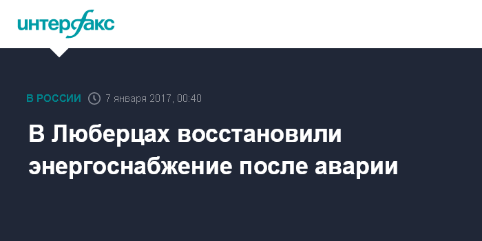 Москва. 7 января. INTERFAX.RU - Авария на питающем центре в Люберцах, оставившая в пятницу без электроснабжения около 100 тысяч человек в Подмосковье, устранена, сообщили "Интерфаксу" в местной администрации.