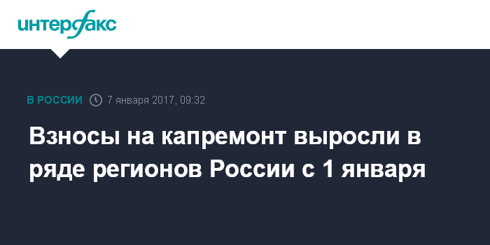Москва. 7 января. INTERFAX.RU - Взносы на капремонт многоквартирных домов выросли в ряде регионах РФ с 1 января 2017 года, сообщает "Российская газета".