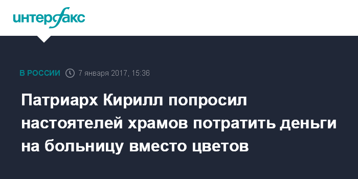 Москва. 7 января. INTERFAX.RU - Патриарх Московский и всея Руси Кирилл благословил настоятелей московских храмов направить средства, которые они планировали потратить на цветы к Рождеству, на благотворительный счет больницы святителя Алексия для приобретения современного оборудования - ультразвукового скальпеля, который позволит сделать новый шаг в развитии хирургической службы больницы.