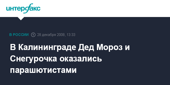 Калининград. 28 декабря. INTERFAX.RU - В Калининграде к детям из детского дома Дед Мороз и Снегурочка спустились с неба на парашютах, сообщил "Интерфаксу" в воскресенье директор авиаклуба регионального РОСТО Виктор Васенев.