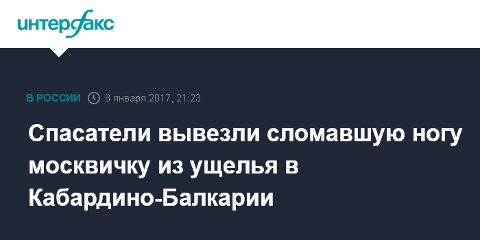 Москва. 8 января. INTERFAX.RU - Травмированную туристку спасатели транспортируют в больницу из ущелья Адыл-Су в Кабардино-Балкарии, сообщил агентству "Интерфакс" оперативный дежурный Эльбрусского высокогорного поисково-спасательного отряда (ЭВПСО) МЧС России в воскресенье.