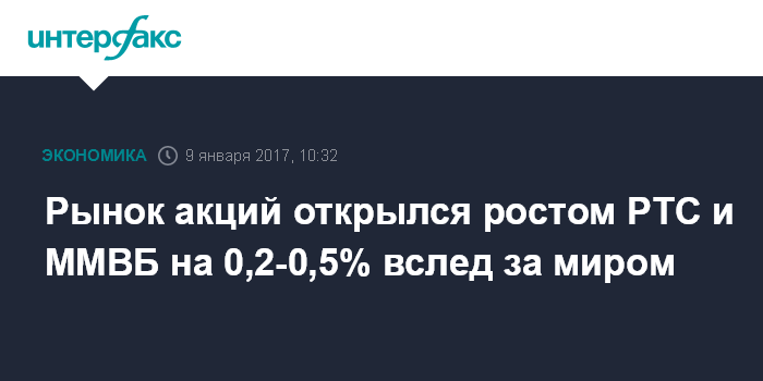 Москва. 9 января. INTERFAX.RU - Рынок акций РФ открылся в понедельник цен blue chips на фоне позитивной динамики мировых фондовых площадок, индексы РТС и ММВБ за минуту торгов прибавили 0,2-0,5%.
