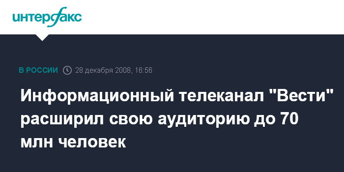 "В 2008 году аудитория телеканала "Вести" в кабельных и эфирных частотах увеличилась на 13 миллионов и составила 70 млн. человек. Рейтинги канала среди премиальной аудитории (в основном мужчины 25-44 лет, чья активность влияет на экономическую, политическую и социальную составляющие) выросли в два раза. "Вести" вошли в тройку самых влиятельных телеканалов среди бизнес-аудитории и стал лидером по цитируемости", - сообщает пресс-служба телеканала "Вести", ссылаясь на данные различных независимых исследований.