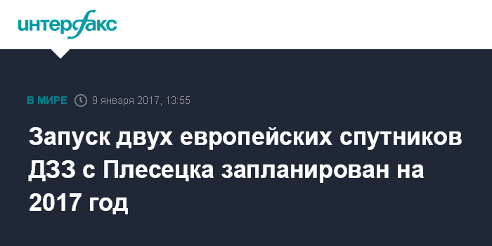 Москва. 9 января. INTERFAX.RU - Два европейских спутника дистанционного зондирования Земли стартуют с российского космодрома Плесецк в середине и во второй половине 2017 года, сообщил "Интерфаксу" источник в ракетно-космической отрасли.