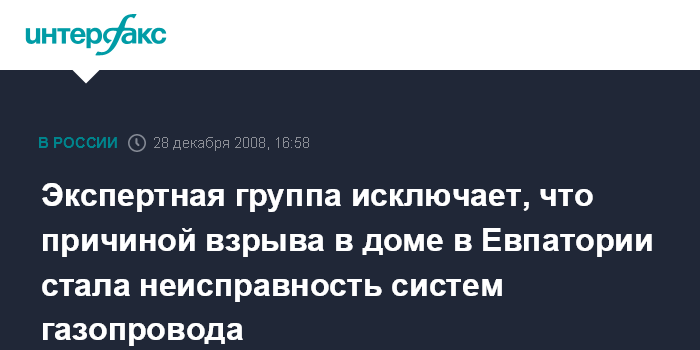 Киев. 28 декабря. INTERFAX.RU - Глава экспертной группы Владимир Киселев исключает, что неисправность подводящих систем газопровода стала причиной взрыва в жилом доме в Евпатории.