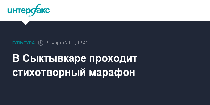 Сыктывкар. 21 марта. INTERFAX.RU - Всемирный день поэзии в Сыктывкаре в пятницу отмечают 10-часовым стихотворным марафоном, сообщили "Интерфаксу" в союзе писателей Коми. В республиканском доме творчества известные и молодые поэты без перерыва читают свои лучшие произведения. На прочтение своих работ каждому поэту отводится 30 минут. В этом году перед зрителями выступит около 30 авторов. Завершится поэтический марафон в 22:00 по московскому времени.