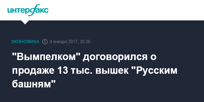 Москва. 9 января. INTERFAX.RU - ПАО "Вымпелком" договорилось о продаже около 13 тысяч своих вышек инфраструктурной компании "Русские башни", сообщил "Интерфаксу" источник, знакомый с переговорами.