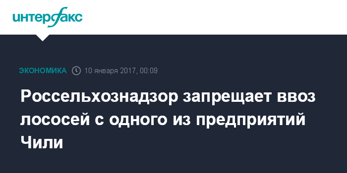 Москва. 10 января. INTERFAX.RU - Россельхознадзор с 10 января 2017 года запрещает поставки лососей с одного из предприятий Чили - Salmones Blumar.
