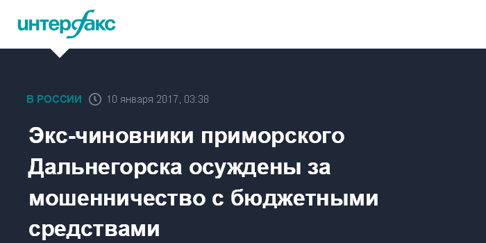 Москва. 10 января. INTERFAX.RU - Суд в Приморье приговорил к реальному лишению свободы экс-чиновников администрации Дальнегорского городского округа, обвиняемых в хищении свыше 6 млн рублей бюджетных средств.