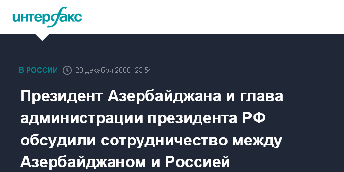 Баку. 28 декабря. ИНТЕРФАКС-АЗЕРБАЙДЖАН - Президент Азербайджана Ильхам Алиев встретился в воскресенье с руководителем администрации президента Российской Федерации Сергеем Нарышкиным, сообщили агентству "Интерфакс-Азербайджан" в администрации главы республики.
