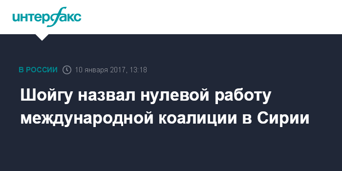 Москва. 10 января. INTERFAX.RU - Воздушно-космические силы (ВКС) выполнили в Сирии поставленную президентом России задачу, а международная коалиция во главе с США сработала не просто "по нулям", но даже в минус, заявил министр обороны РФ генерал армии Сергей Шойгу.