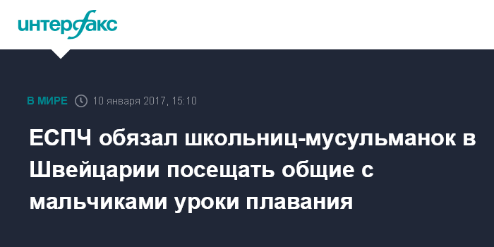 Москва. 10 января. INTERFAX.RU - Европейский суд по правам человека (ЕСПЧ) постановил, что посещение школьницами-мусульманками уроков плавания вместе с мальчиками не нарушает право на свободу вероисповедания, говорится в коммюнике суда, распространенном во вторник.