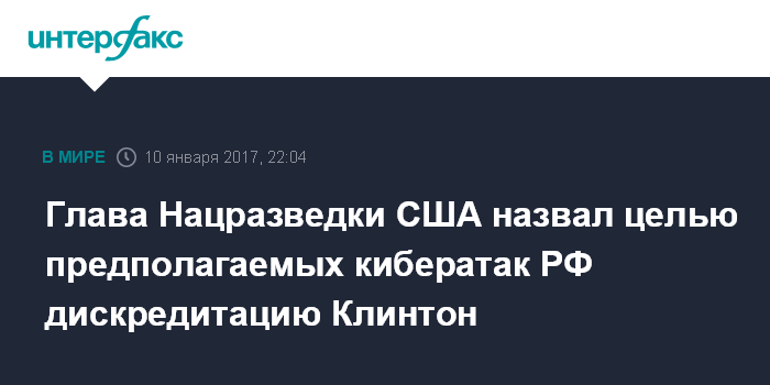 Москва. 10 января. INTERFAX.RU - Цель хакерских действий из России состояла в том, чтобы дискредитировать кандидата от демократов Хиллари Клинтон и чтобы лишить ее возможности стать президентом США. Такое мнение, выступая во вторник перед конгрессменами, выразил глава Национальной разведки США Джеймс Клеппер.