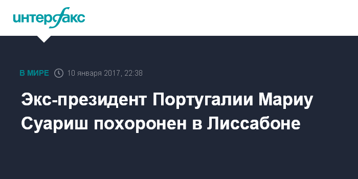 Москва. 10 января. INTERFAX.RU - Бывший президент Португалии и основатель Социалистической партии страны Мариу Суариш был похоронен во вторник в Лиссабоне, сообщает Publico.