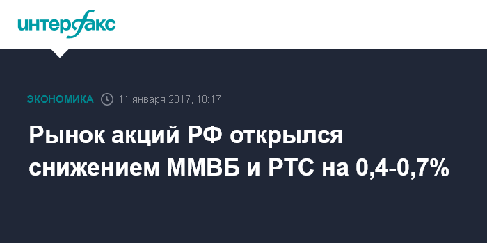 Москва. 11 января. INTERFAX.RU - Рынок акций РФ открылся в среду снижением цен blue chips на фоне упавшей накануне нефти, индексы ММВБ и РТС за минуту торгов потеряли 0,4-0,7%; растут на 6% акции "Мечела" .