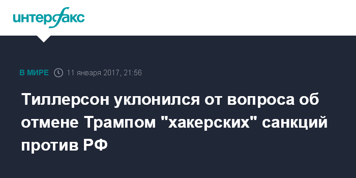Москва. 11 января. INTERFAX.RU - Кандидат на пост госсекретаря США Рекс Тиллерсон не дал прямого ответа на вопрос, отменит ли администрация избранного президента США Дональда Трампа санкции, введенные против России из-за обвинений в кибератаках.