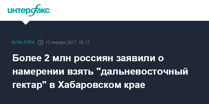 Москва. 12 января. INTERFAX.RU - Граждане России из многих регионов страны заявили о намерении взять "дальневосточный гектар" в Хабаровском крае, сообщила журналистам и.о. зампредседателя правительства края - министра инвестиционной и земельно-имущественной политики Ирина Серова.