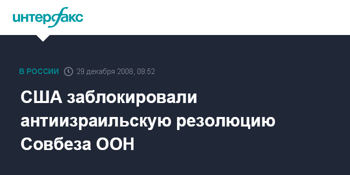 Москва. 29 декабря. INTERFAX.RU - США наложили вето на резолюцию ООН, направленную на прекращение военных действий со стороны Израиля в секторе Газа, сообщил в воскресенье иранский англоязычный телеканал "Пресс-ТВ". В соответствии с вето, Совбез ООН смог лишь сделать "необязательным" выполнение резолюции по добровольному прекращению огня Израилем и немедленному завершению военных действий.