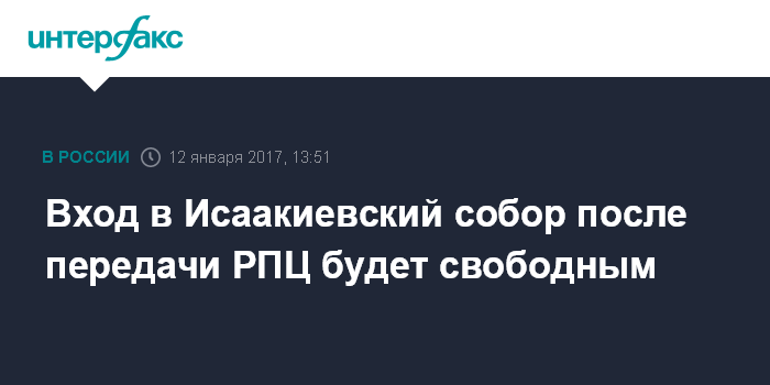 Москва. 12 января. INTERFAX.RU - Вход в Исаакиевский собор Петербурга после перехода в пользование Русской православной церкви будет свободным, при этом в соборе сохранится экскурсионная деятельность.