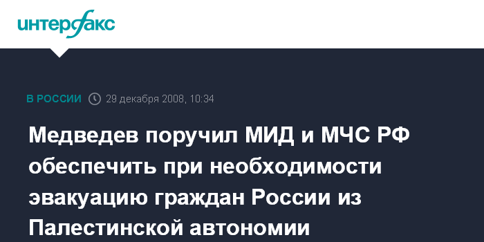 Москва. 29 декабря. INTERFAX.RU - Президент РФ Дмитрий Медведев поручил главам МИД и МЧС Сергею Лаврову и Сергею Шойгу оказать всю возможную и необходимую помощь гражданам России, находящимся на территории Палестинской автономии, включая при необходимости их эвакуацию, сообщили "Интерфаксу" в понедельник в пресс-службе Кремля.
