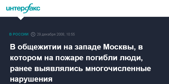Он добавил, что материалы по результатам проверки были направлены в прокуратуру и органы внутренних дел Дорогомиловского района. "Выявленные нарушения не были устранены и способствовали возникновению пожара, который привел к гибели двух людей и ранениям трех человек", - сказал Е.Бобылев.