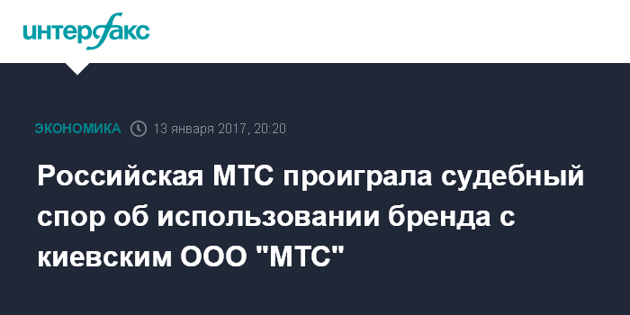 Москва. 13 января. INTERFAX.RU - Апелляционный хозяйственный суд Киева отменил решение суда первой инстанции и отказал в иске ПАО "Мобильные Телесистемы" (Москва) и ПрАО "МТС Украина" (Киев) против ООО "МТС" (Киев) о досрочном прекращении действия свидетельства на право использовать товарный знак "МТС" на территории Украины. Об этом сообщается в постановлении данного суда от 14 декабря 2016 года, обнародованном в государственном реестре судебных решений.