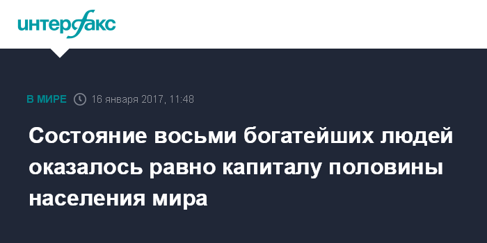 Москва. 16 января. INTERFAX.RU - Восемь самых богатых людей в мире обладают таким же состоянием, как 3,6 млрд человек, говорится в отчете неправительственной организации Oxfam, занимающейся борьбой с бедностью.