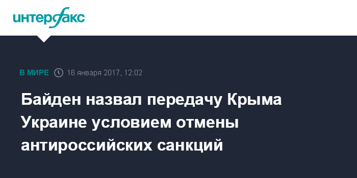 Москва. 16 января. INTERFAX.RU - Вице-президент США Джозеф Байден заявляет, что международные санкции против Российской Федерации должны сохраняться до выполнения ею взятых на себя обязательств в рамках Минских договоренностей, а также возвращения Украине Крыма.