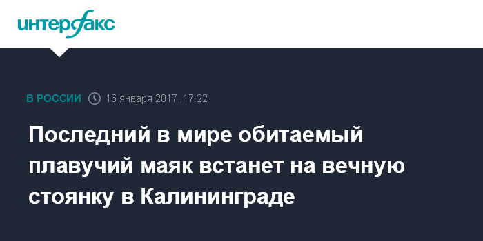 Москва. 16 января. INTERFAX.RU - Бывший плавучий маяк Балтийского флота "Ирбенский" встанет на вечную стоянку в Калининграде, сообщил "Интерфаксу" заместитель директора Калининградского музея Мирового океана Алексей Шуткин. "Окончательно определено место стоянки нашего нового корабля-музея. Решено, что "Ирбенский" будет находиться в Калининграде, хотя судно могло остаться в Санкт-Петербурге, где находится музей ледокол "Красин", принадлежащий музею Мирового океана", - отметил Шуткин.