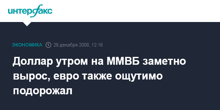 Москва. 29 декабря. INTERFAX.RU - В понедельник с утра и доллар, и евро подросли на ММВБ. Итогом индексной сессии для доллара стало повышение курса до 29,23 руб./$1, или на 22,42 копейки по отношению к текущему официальному курсу ЦБ РФ. Евро поднимался с утра в понедельник намного сильнее, достигая 42 руб./EUR1.