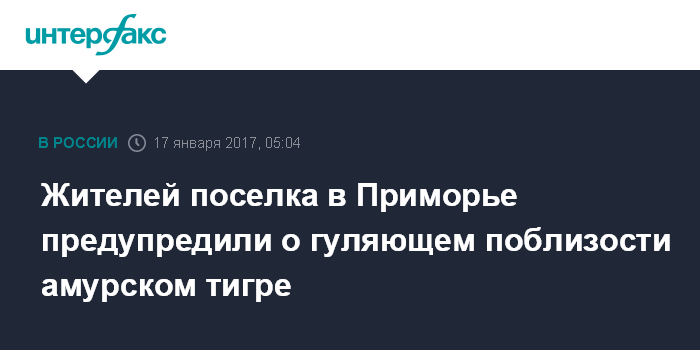 Москва. 17 января. INTERFAX.RU - Следы амурского тигра обнаружили вблизи приморского поселка Артемовский, власти призывают местных жителей проявлять максимальную осторожность.