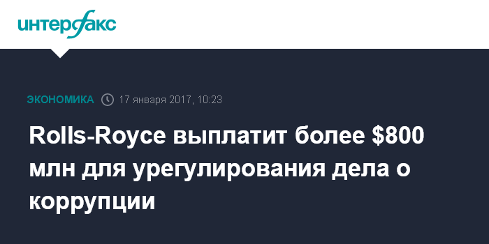 Москва. 17 января. INTERFAX.RU - Британский машиностроительный холдинг Rolls-Royce согласовал выплату 671 млн фунтов стерлингов (свыше $800 млн) регуляторам Бразилии, Великобритании и США в рамках урегулирования коррупционного дела, сообщается в пресс-релизе компании. Rolls-Royce достигла предварительного соглашения с британской Службой по борьбе с крупным мошенничеством (SFO), которое во вторник должно быть одобрено судом. Кроме того, компания договорилась с министерством юстиции США и федеральной прокуратурой Бразилии.