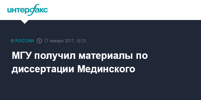 Москва. 17 января. INTERFAX.RU - Исторический факультет МГУ имени Ломоносова получил материалы по диссертации министра культуры Владимира Мединского в декабре, они будут рассмотрены в законном порядке, заявил "Интерфаксу" декан факультета профессор Иван Тучков.