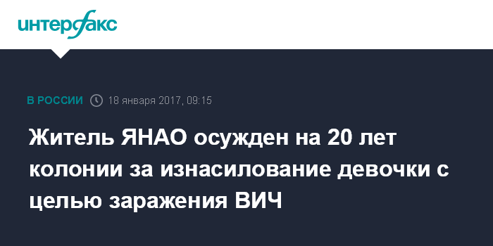 Москва. 18 января. INTERFAX.RU - Суд в Ямало-Ненецком автономном округе признал ВИЧ-инфицированного жителя города Лабытнанги виновным в изнасиловании ребенка и приговорил к 20 годам колонии строгого режима.