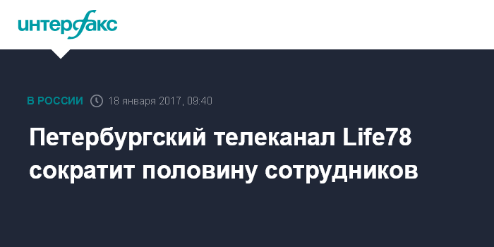 Москва. 18 января. INTERFAX.RU - Петербургский телеканал Life78 в ближайшее время сократит половину сотрудников и будет транслировать федеральный эфир с местными включениями, сообщил "Интерфаксу" источник в холдинге News Media (управляет телеканалом) в среду.
