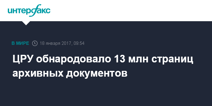 Москва. 18 января. INTERFAX.RU - Центральное разведывательное управление США (ЦРУ) выложило в открытый сетевой доступ около 13 млн страниц архивных документов о своей деятельности, сообщает в среду американский телеканал CNN.