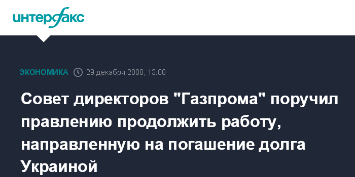 Как сообщила пресс-служба "Газпрома", по итогам заседания "совет директоров поручил правлению компании продолжить работу, направленную на полное погашение украинской стороной имеющейся задолженности, подписание новых контрактов на поставку газа в 2009 г. и обеспечение гарантий своевременной оплаты за поставленный газ в будущем".