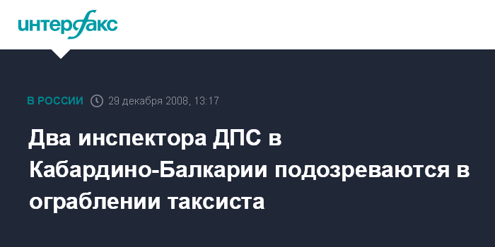 Москва. 29 декабря. INTERFAX.RU - В городе Прохладном (Кабардино-Балкария) задержаны два инспектора ДПС, подозреваемые в ограблении таксиста.