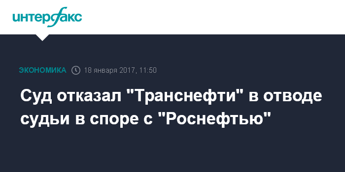 Москва. 18 января. INTERFAX.RU - Арбитражный суд Москвы отказал "Транснефти" в удовлетворении заявления об отводе судьи в разбирательстве с "Роснефтью" о договоре на транспортировку нефти в 2017 году, передал корреспондент "Интерфакса" из суда. Ранее в среду адвокаты "Транснефти" подали заявление об отводе судьи.