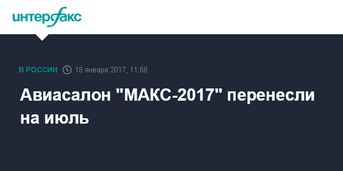 Москва. 18 января. INTERFAX.RU - Международный авиационно-космический салон "МАКС-2017" перенесли с августа на июль, сообщил "Интерфаксу" в среду почетный президент авиасалона, известный летчик-испытатель, Герой России Магомед Толбоев.