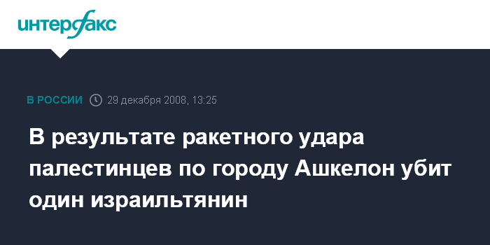 Москва. 29 декабря. INTERFAX.RU - Один израильтянин убит и еще девять ранены в результате ракетного удара палестинцев по стройплощадке, расположенной в израильском городе Ашкелон, сообщает интернет-сайт израильской газеты "Гаарец"."Я нахожусь рядом с телом. К моему большому сожалению, у нас случилась несчастье. Он был убит", - сообщил мэр Ашкелона Беньямин Вакнин.