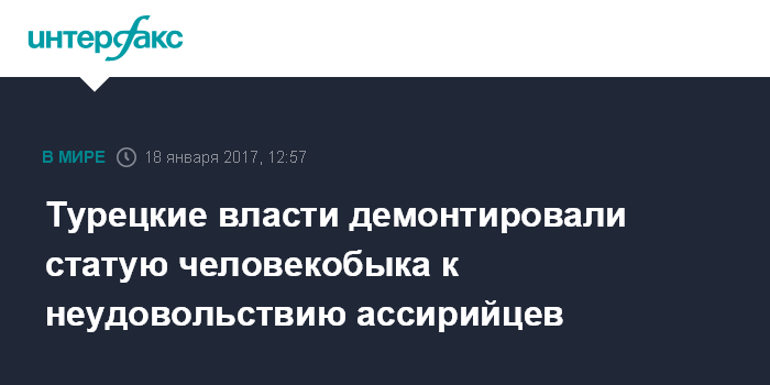 Москва. 18 января. INTERFAX.RU - Администрация турецкого города Диярбакыр убрали скульптуру крылатого человекобыка (Ламассу) - персонажа ассирийской мифологии - с площади перед зданием городского совета, сообщает в среду арабское издание "Аль-Масдар".