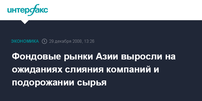Фондовые рынки Азии выросли на ожиданиях слияния компаний и подорожании сырья