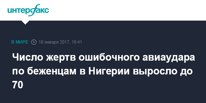 Москва. 18 января. INTERFAX.RU - По меньшей мере 70 человек погибли и 100 получили ранения в результате осуществленного днем ранее ошибочного авиаудара ВВС Нигерии по лагерю беженцев в городе Рэнн, сообщают в среду западные СМИ.